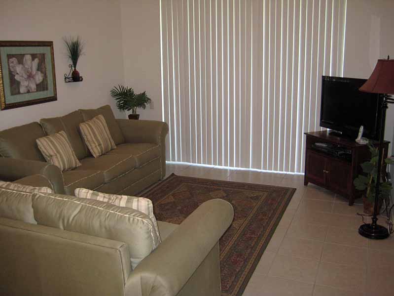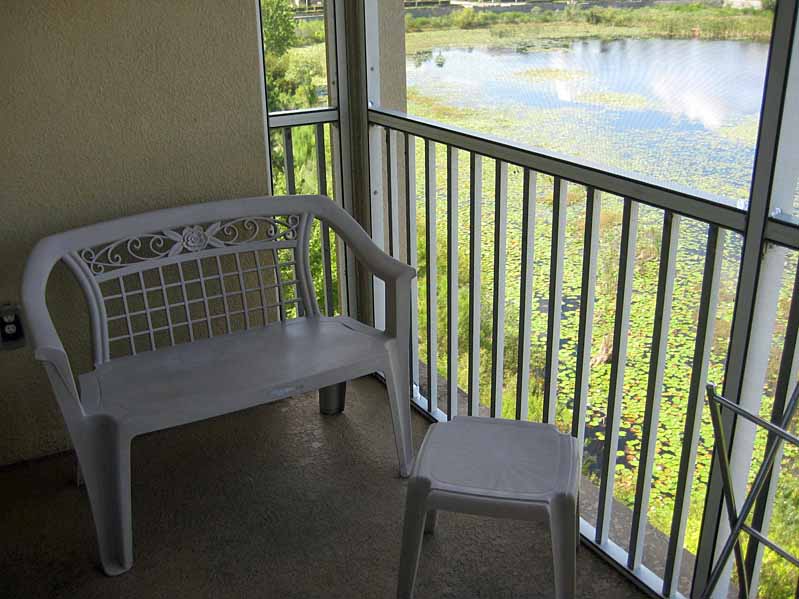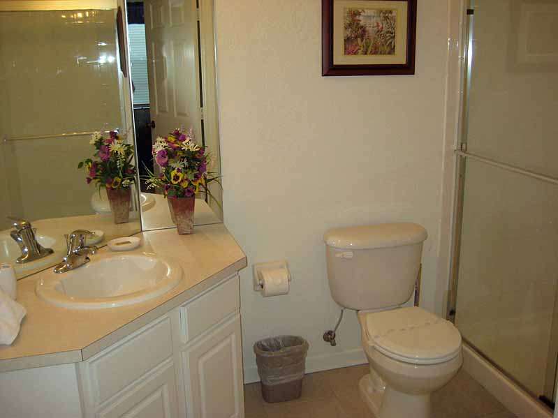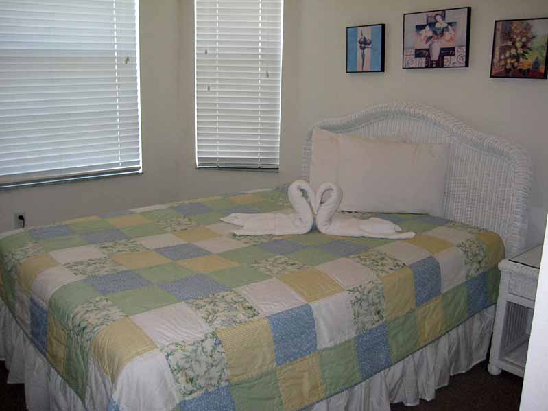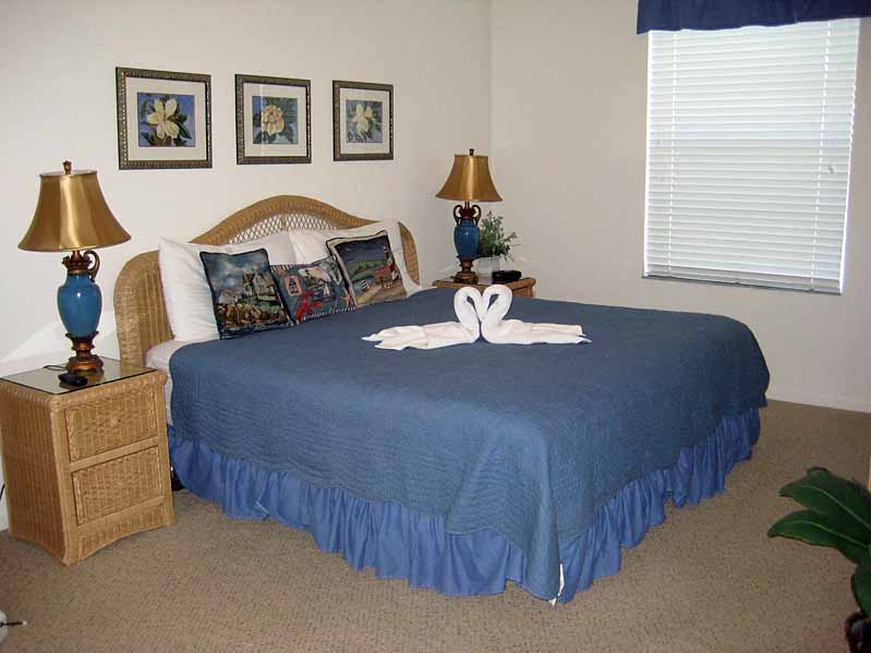 The Disney condo boasts a lounge with sofa and love seat, an armoire with a large screen cable TV, plus a DVD player. The lounge opens onto a balcony where you can spend the evening watching the sunset . Leading off the lounge is a dining area and breakfast bar that provides combined seating for up to 6 guests. The well equipped and spacious galley kitchen, with range, microwave, fridge/freezer, plus utensils, crockery and appliances required for that perfect family meal together. The master bedroom enjoys a king-size bed, with night-stands, lamps, telephone, clock/radio and dresser with cable TV and generous walk-in closet space. The master bedroom features a private bathroom with toilet, vanity unit, plus a shower. Two more bedrooms are configured with queen bed and 2 twin beds, nightstands, dresser with cable TV, plus closet space and an adjacent (shared) family bathroom.